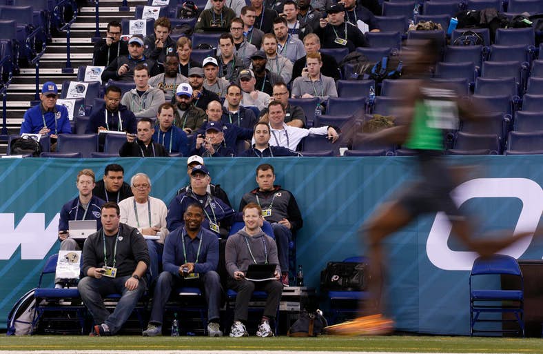 The traditional method of assessing whether a player should be acquired by a team involves the practice of having coaching staff or scouts watch each potential recruit perform in a game or practice and create their own judgement based on what they have seen from successful players in the past. This is common practice, especially before the NFL Draft, which led to the creation of the NFL Combine. This annual event brings together the top college football prospects to practice for scouts from every team. The image below shows a picture of scouts evaluating a player at the combine.