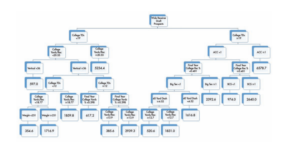 The image below shows an example of a decision tree that predicts the future success of wide receiver draft prospects based on statistics and attributes of each player that was found to be statistically significant. Some examples of these data points are the university that they attended, the number of touchdowns they scored in college, and the player’s forty yard dash time.